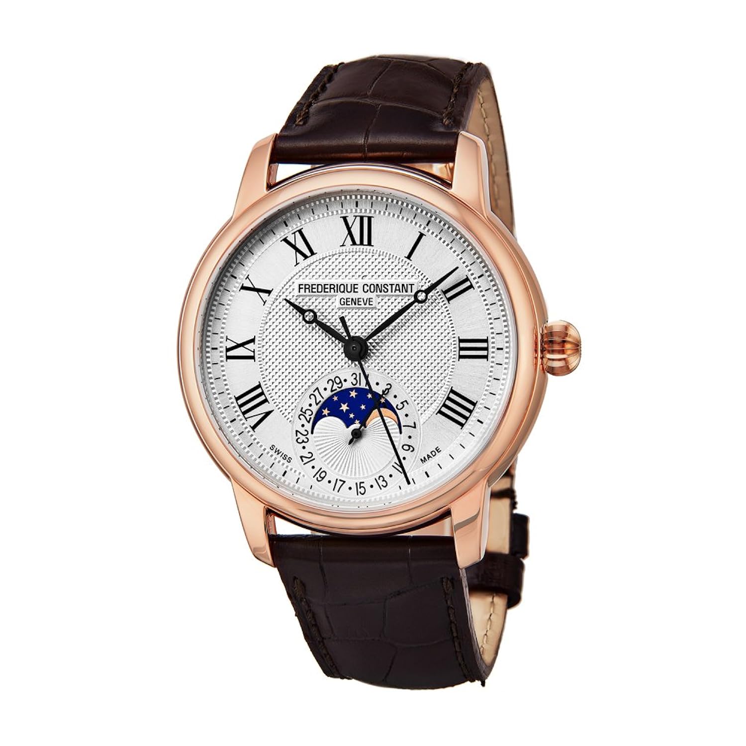 Frederique Constant Moonphase Automatic Classics Mens Plated Rose Gold Watch - Silver Face Brown Leather Band Swiss Automatic Moon Phase Watch For Men FC-715MC4H4
