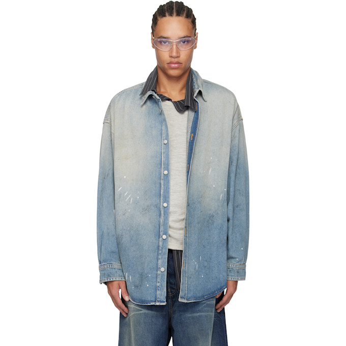 Non-stretch organic cotton-blend denim shirt. Fading, smudging, and paint splatter throughout.
